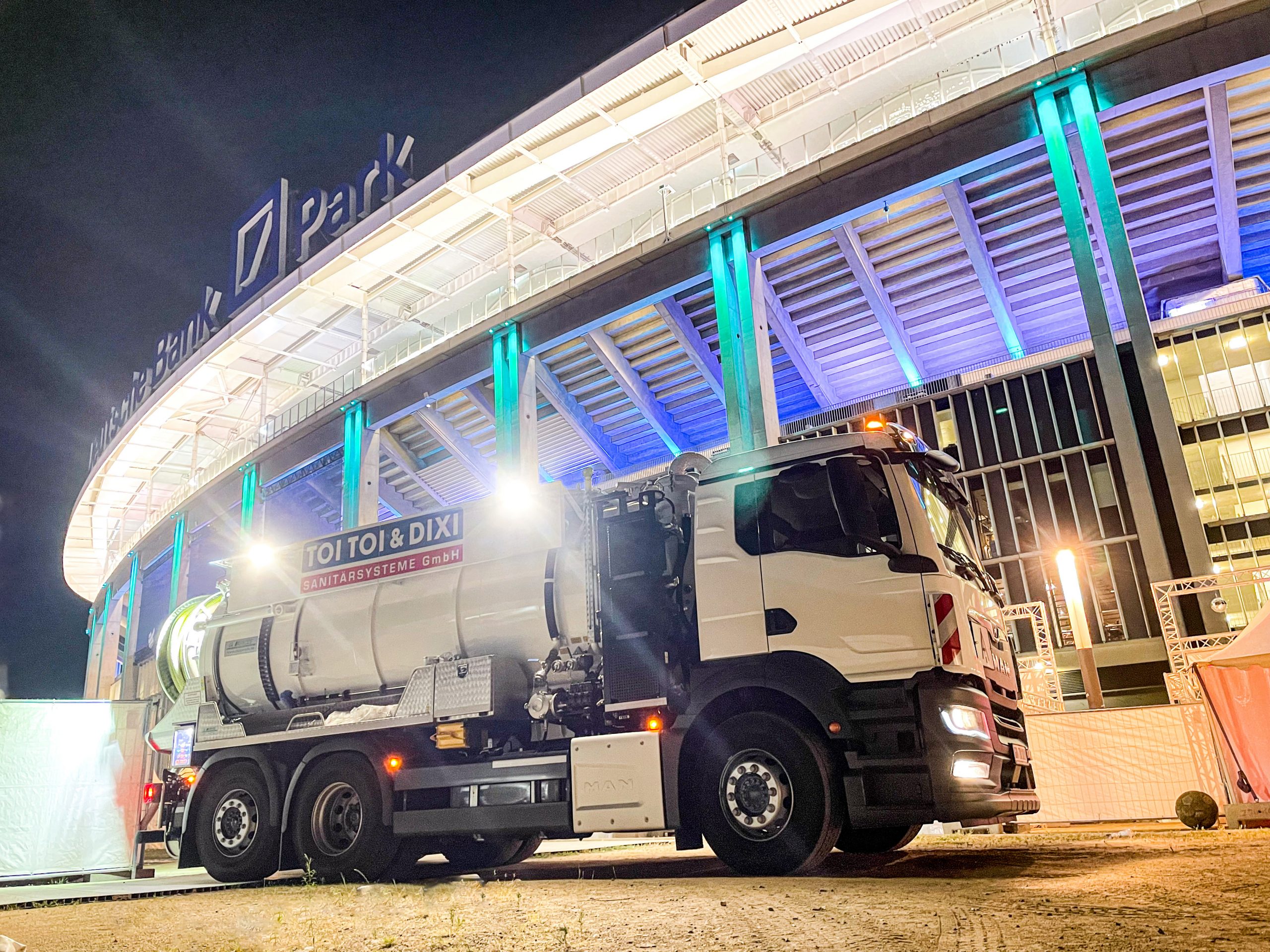 Bei über 50.000 Besucherinnen und Besuchern entstehen an den Sanitäranlagen extreme Lastspitzen. Der laufende, hochgetaktete Festivalbetrieb im Stadion darf logistisch zu keinem Zeitpunkt gestört werden.
